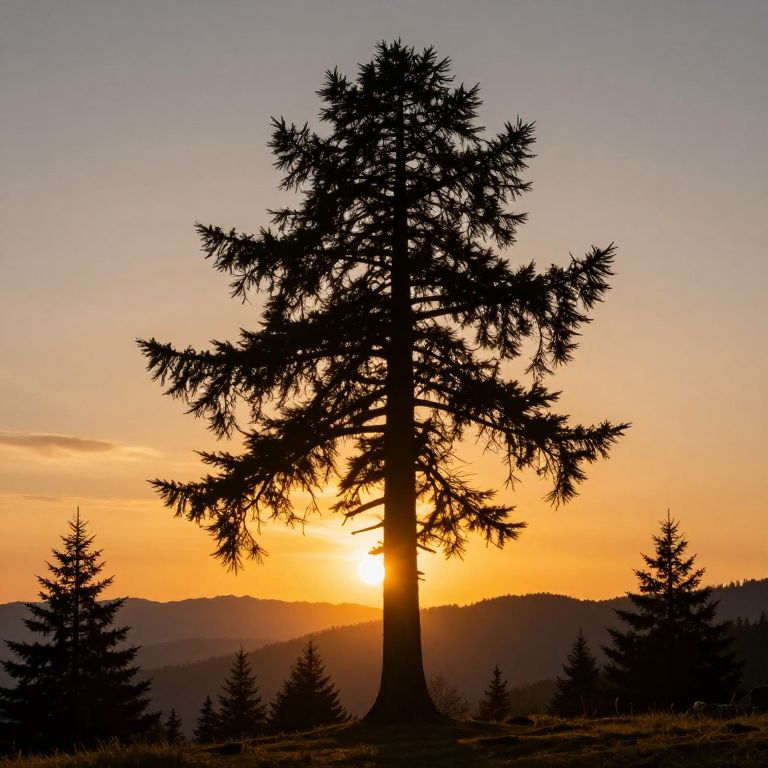 Giant spruce tree silhouetted against a vibrant sunset, its branches reaching skyward as golden light bathes the landscape, framed by distant mountains and scattered evergreens.