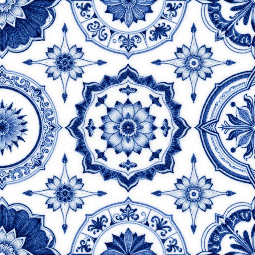 Chinese art patterns showcasing symmetrical designs with bold blue and white porcelain inspired elements, delicate lotus flowers, waves, and geometric shapes in a seamless repeat pattern, blending historical aesthetic with elegant, refined detailing.