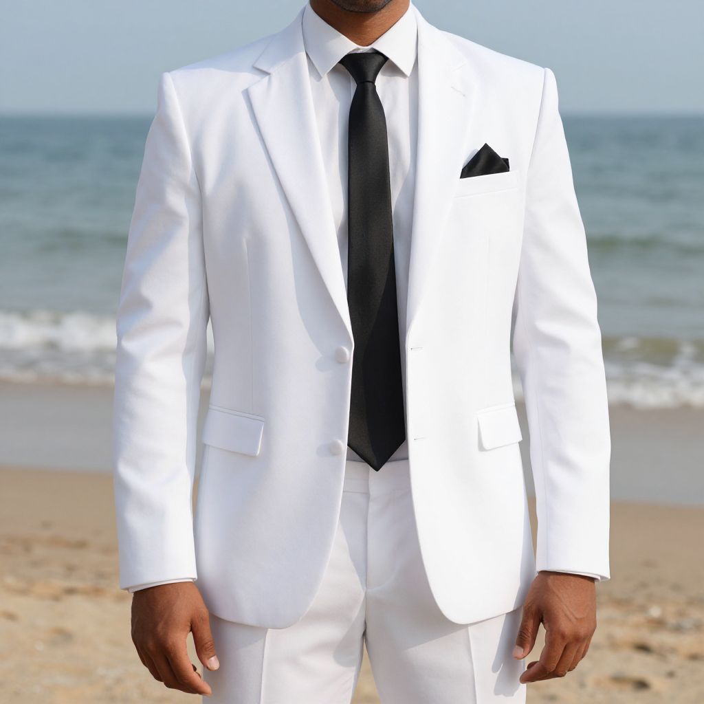 Photograph of a man from the neck to mid-thigh, standing on a beach with the ocean in the background. He is wearing a crisp white suit with a black tie and a black pocket square in the breast pocket. His skin tone is dark, and he has a trimmed beard. The suit is well-fitted, highlighting his slender build. The ocean is calm with small waves, and the sky is clear and blue. The sandy beach is visible in the foreground. The overall image has a bright, daytime ambiance.