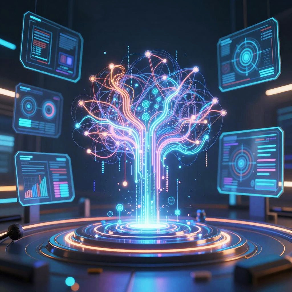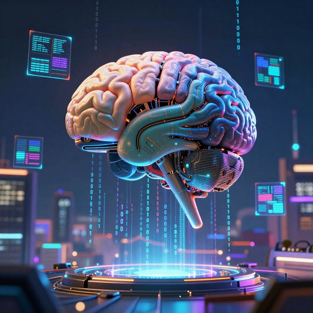 Generate AI themed digital painting illustrating an advanced AI system integrated into a vast network of glowing servers and quantum computers, data particles swirling, abstract representation of intelligence and machine learning, with vibrant electric blues and whites.