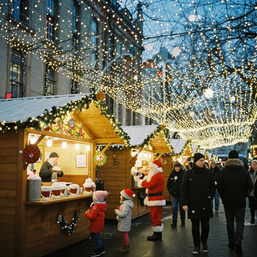 A festive Christmas market under a canopy of twinkling fairy lights, wooden huts with colorful decorations, hot chocolate stalls, children laughing with Santa Claus, snowflakes falling, rich colors and warm lighting, 35mm film photography, low angle shot to emphasize height of decorations