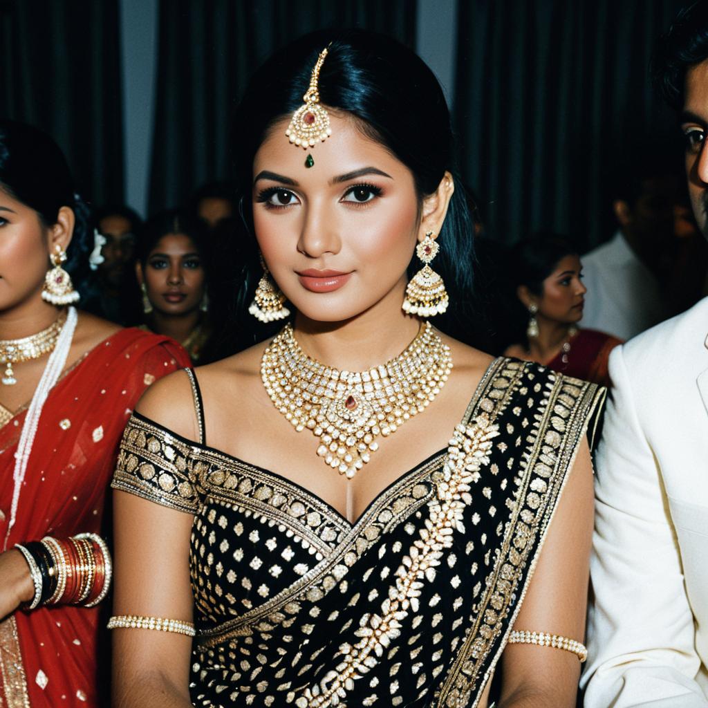 Portrait of an Indian woman dressed in a black saree with gold embroidery, adorned with traditional gold and pearl jewelry including a necklace, earrings, bracelet, and maang tikka. She has black hair styled back and is wearing makeup. The setting appears to be a wedding or festive event with other attendees in the background.