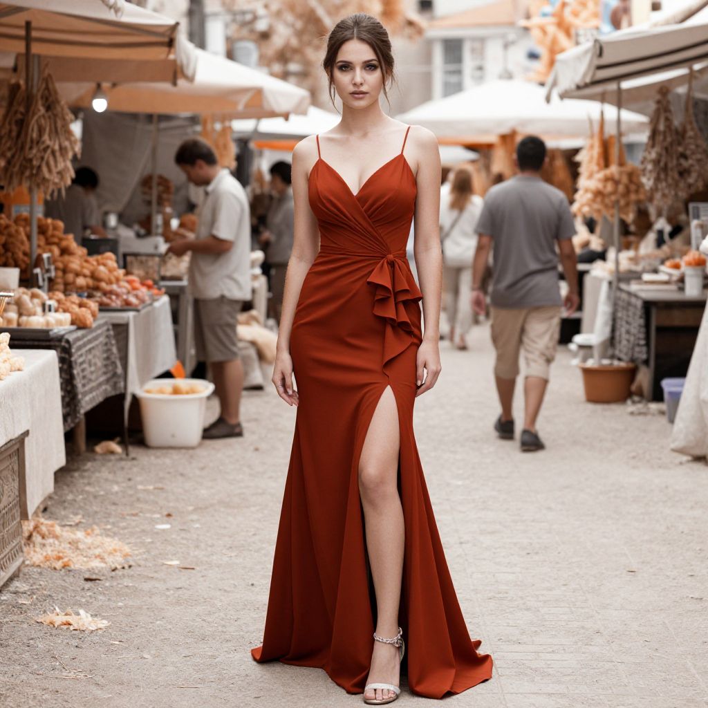 A Petite woman, sophisticated elegance, sleeveless floor-length gown in deep terracotta, V-neckline, spaghetti straps, fitted bodice, cascading ruffle detail, high leg slit, strappy silver heels, bustling street bazaar. Infrared photography, surreal colors, otherworldly feel Sexy. Pretty face and beаutiful eyes. Big breasts
