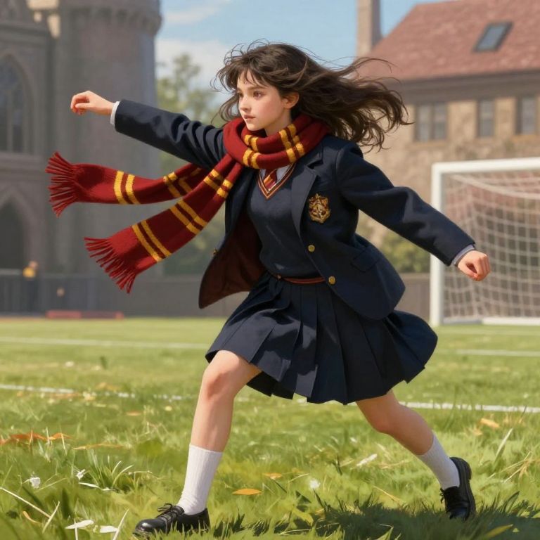 Hogwarts uniform female student in Quidditch pitch, dynamic action pose wearing full school uniform with scarf, wind-blown hair, vivid colors, epic fantasy atmosphere, digital painting