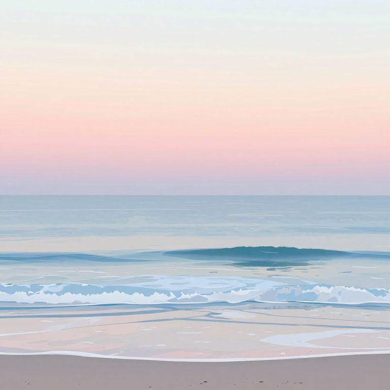 Digital painting of a serene beach at sunset, featuring gentle waves, pastel pink and blue gradient sky, and sandy shoreline.