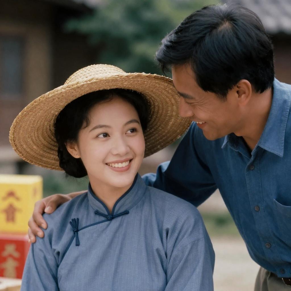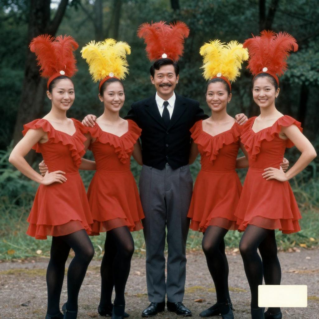 Vintage photograph of a man and four women in red dance costumes with large feathered hats. The man, in a black jacket and gray pants, stands in the center. Women surround him, smiling, with arms around each other. Green forest background. The women wear ruffled dresses and black stockings. Large feathered hats are red and yellow. The man has a mustache. Text box in bottom right corner. Forest trees in background.