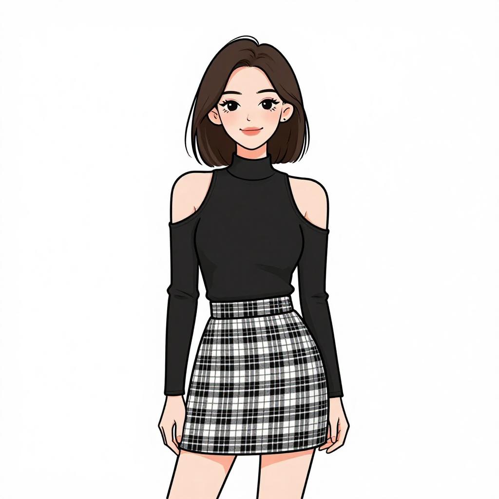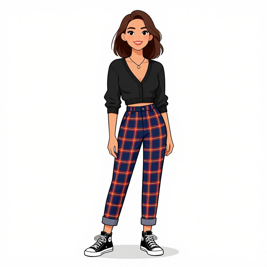Woman with pretty face and pretty hair. smiling Woman, casual streetwear, cropped black sweatshirt, V-neck, ribbed cuffs and hem, small embroidered logo on chest, high-waisted plaid trousers in brown, yellow, and black, relaxed fit, straight leg, black lace-up ankle boots with chunky sole, white background. --sref 1467
