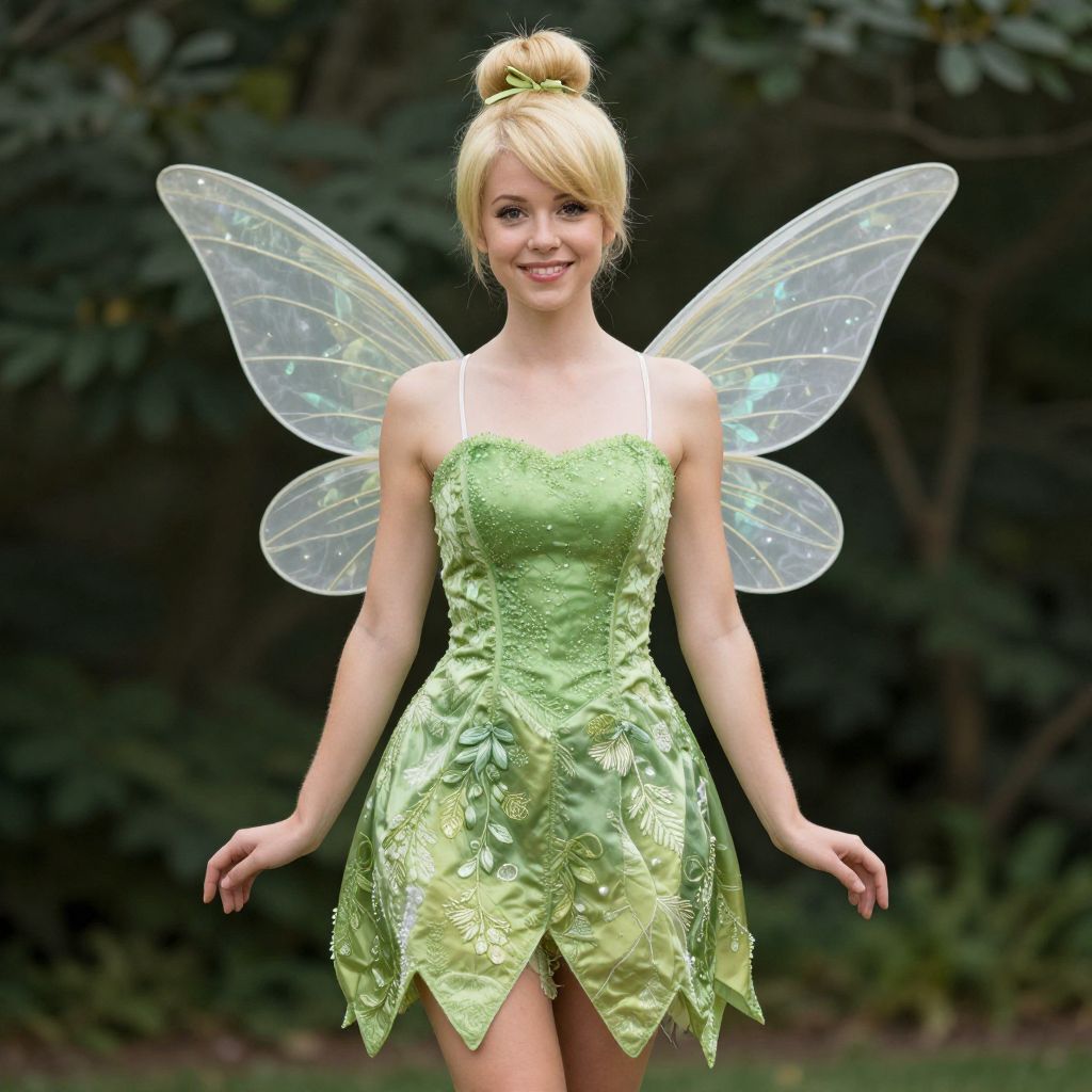 Tinker Bell Costume Woman, fairy in green dress with fairy wings and a tiable