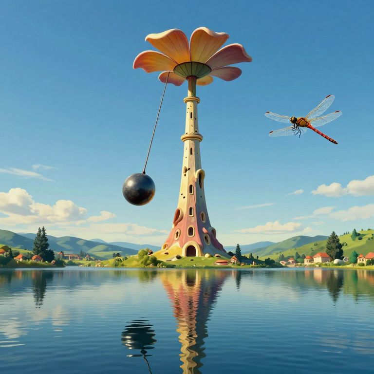 Imagine a surreal landscape featuring a towering tower with melting features, its pendulum resembling a delicate flower petal as it swings gracefully. This panoramic view, reminiscent of Dali-esque dreamscapes, captures the scene from a dragonfly's perspective above a serene lake, where the tower's reflections dance on the water's surface. The vibrant colors and bizarre juxtapositions of realistic and abstract elements evoke a sense of wonder and curiosity about the mysteries hidden in this fantastical world, inviting viewers to explore its enchanting atmosphere.