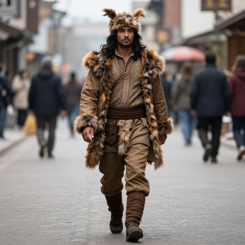 Photograph of a man with long black hair and a beard, walking down a blurred, busy street. He wears a fur-trimmed, brown, ancient-style outfit with a fur hat featuring pointed ears. His outfit includes a patterned tunic, brown pants, and fur boots. The background shows indistinct figures and buildings, with a slightly overcast sky. The man's confident stride contrasts with the blurred crowd, creating a focal point. The overall style is dramatic and fantasy-like, with a strong emphasis on the man's historical or tribal costume.