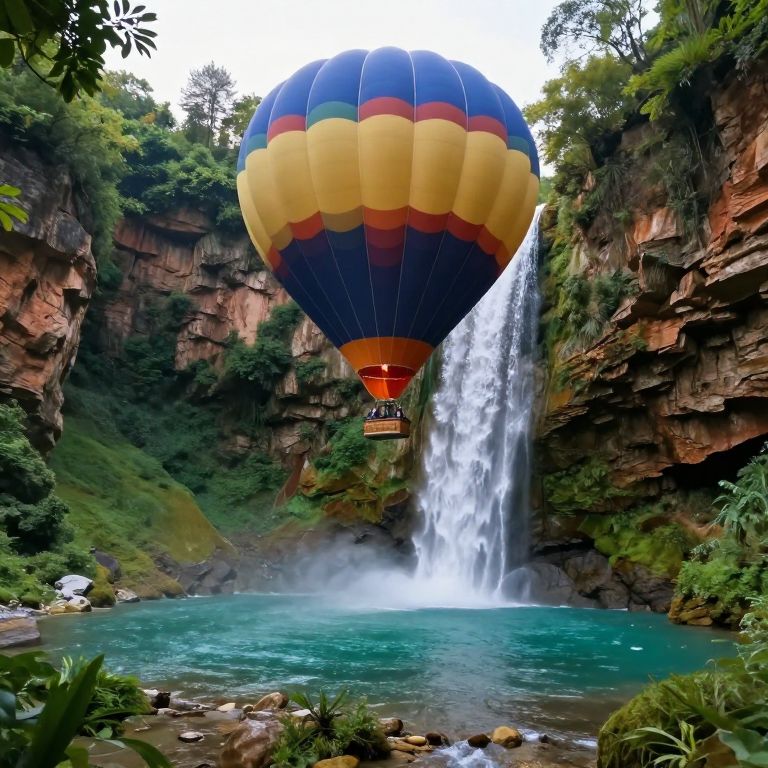Photograph of a colorful hot air balloon hovering above a waterfall, landing in a turquoise pool surrounded by lush, rocky cliffs.