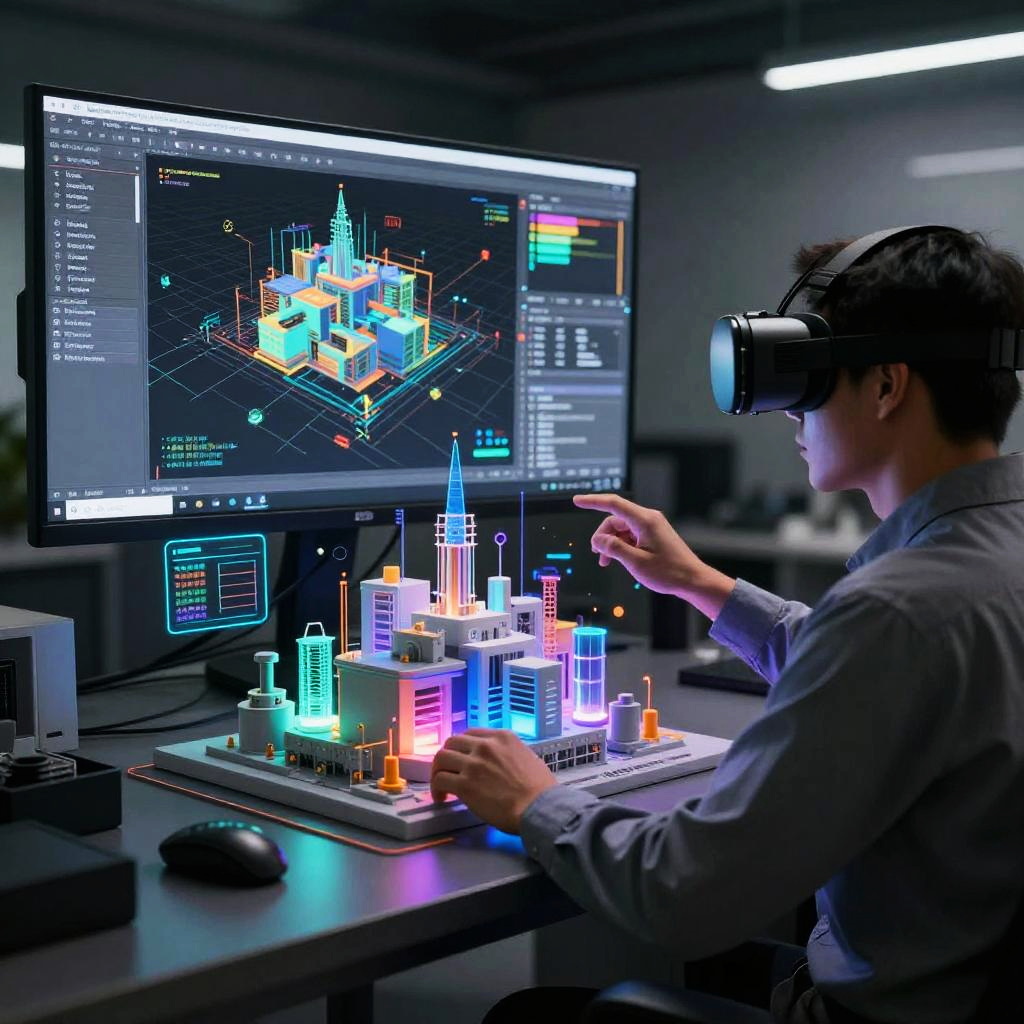 AI CAD design, virtual reality environment showing interactive 3D modeling interface, engineer wearing VR headset manipulating complex structures, vibrant holographic controls and data streams, ambient cyberpunk lighting, detailed digital visualization