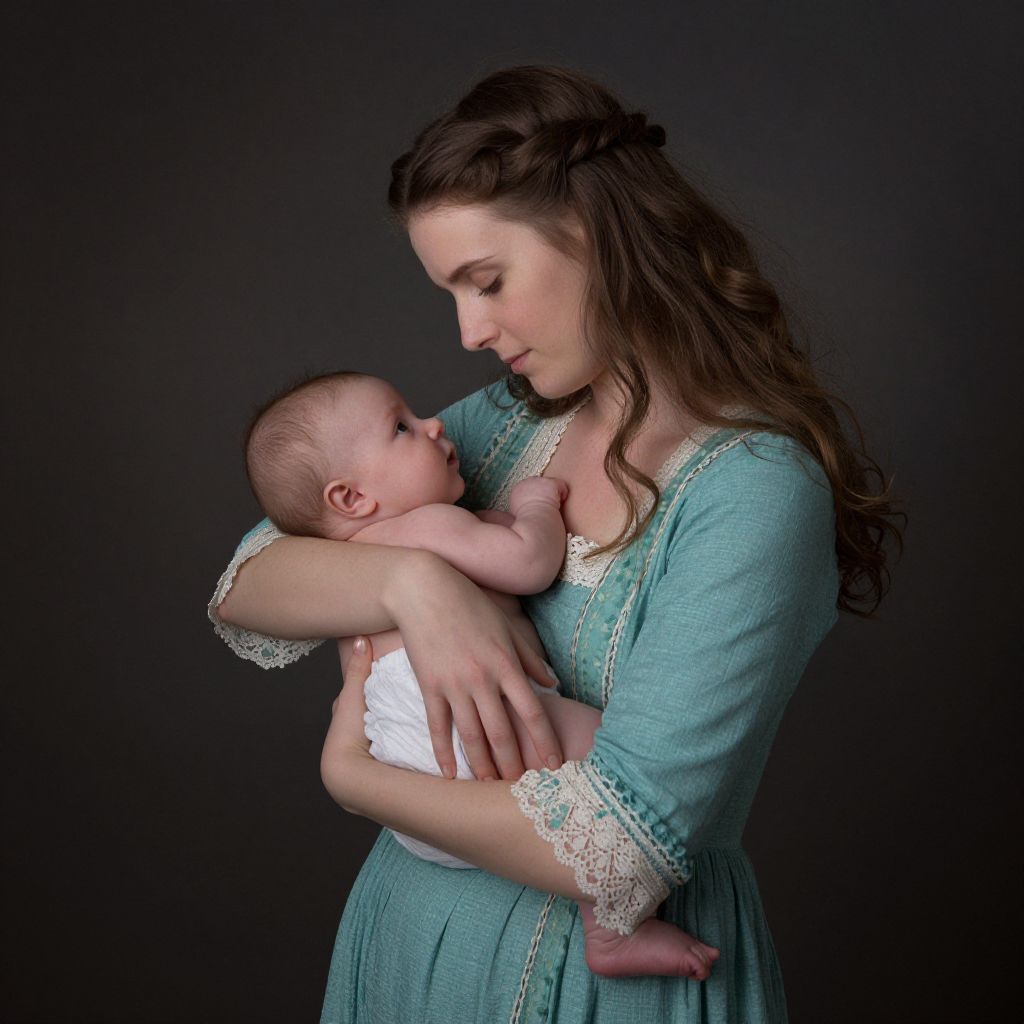 Frederick Goodall's \"Mother and Child\" portrays a tender moment where a woman with long brown hair, dressed in a teal dress with lace trim, holds a baby in her arms, both sharing a serene and intimate connection against a dark, moody background.