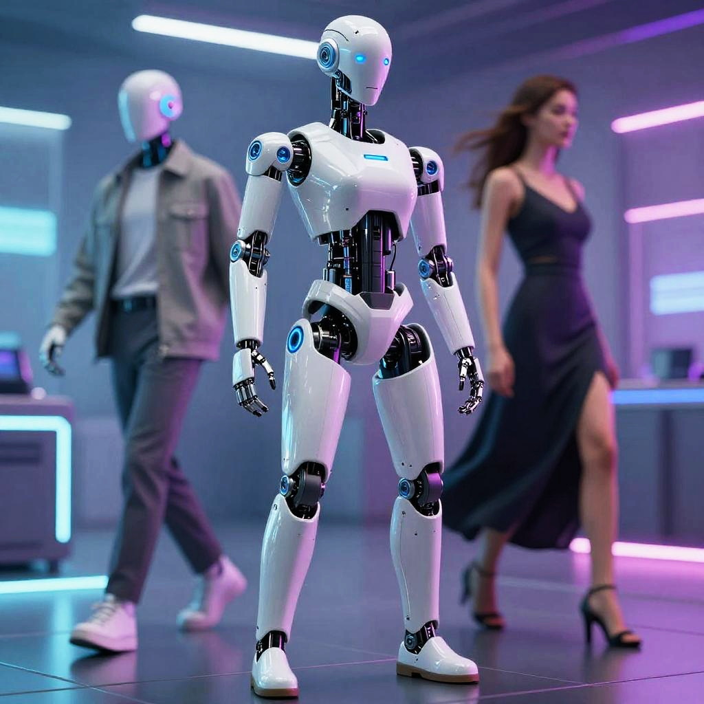 AI change outfit concept, futuristic humanoid robot seamlessly transforming its clothing from casual wear to elegant high fashion, neon-lit digital environment, hyper-detailed cyberpunk aesthetic, dynamic motion blur, vibrant colors, ultra-realistic rendering