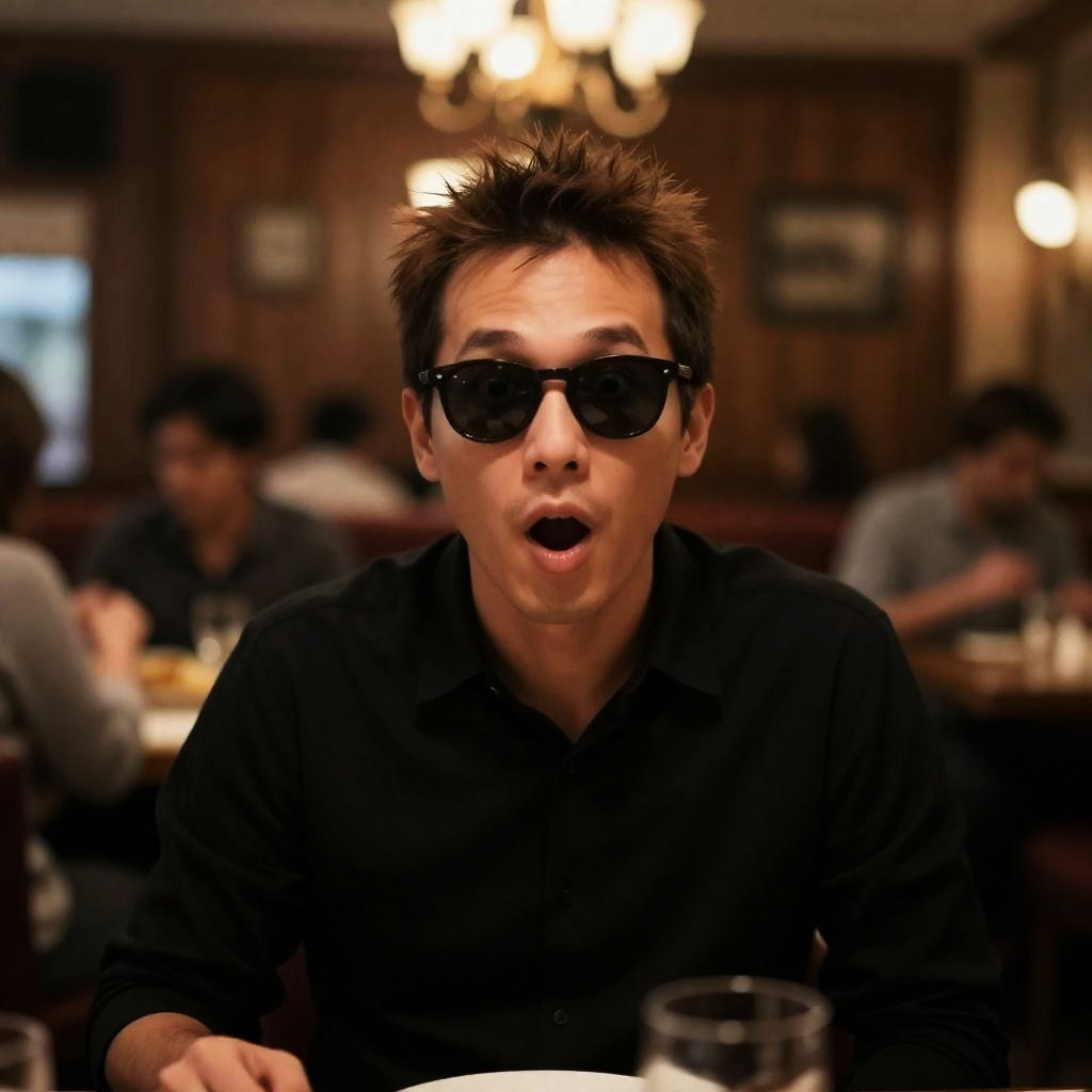 Photograph of a man with short, spiky brown hair and sunglasses, mouth open in surprise. He wears a black shirt, seated at a dimly lit restaurant table with glass in front. Blurred background includes other diners, wooden walls, and chandeliers.