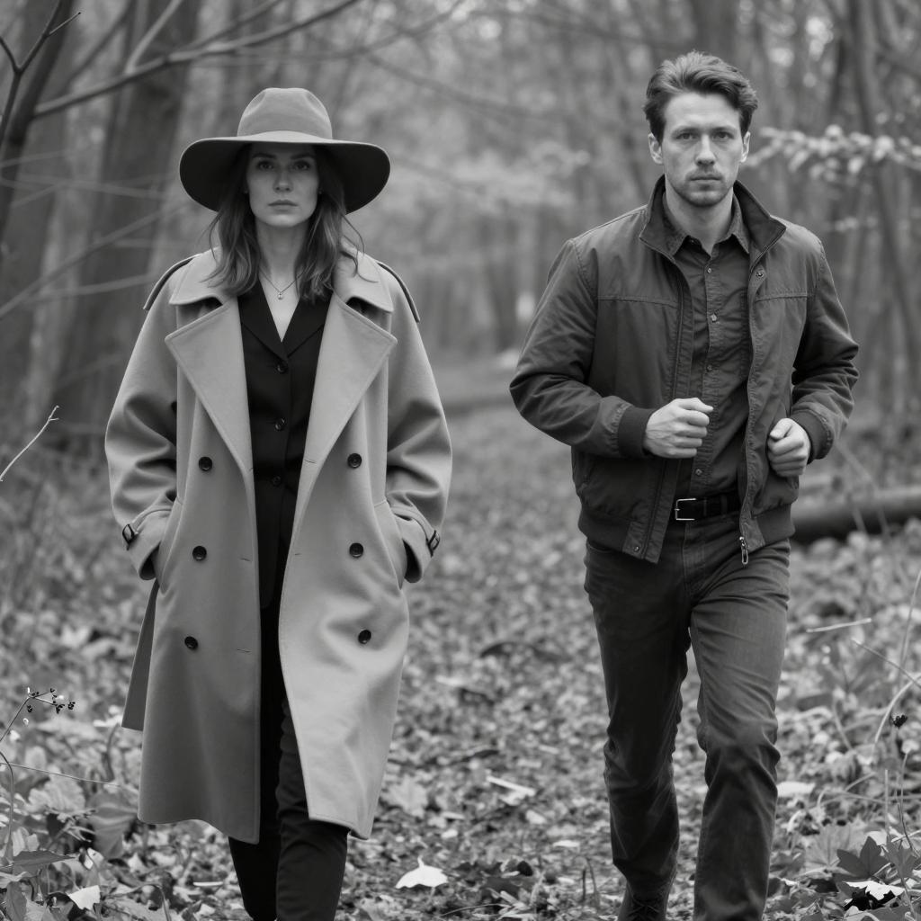 Black and white photograph of two people in a forest. Woman with large hat and draped coat walks left, hands in pockets. Man in jacket and pants runs right, looking forward. Trees in background. Woman's expression neutral, man's intense.