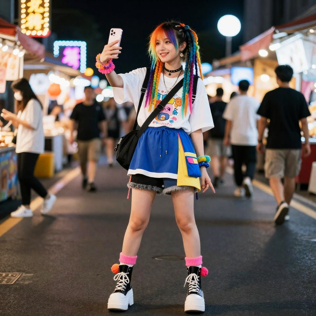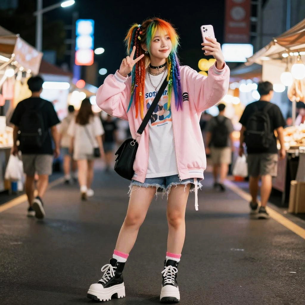 A young non-binary adult with rainbow dreadlocks is taking a selfie in a neon-lit night market, wearing a stylish Harajuku-inspired layered streetwear with platform boots and oversized accessories. She poses with a cheerful peace sign, captured in a semi-realistic style.