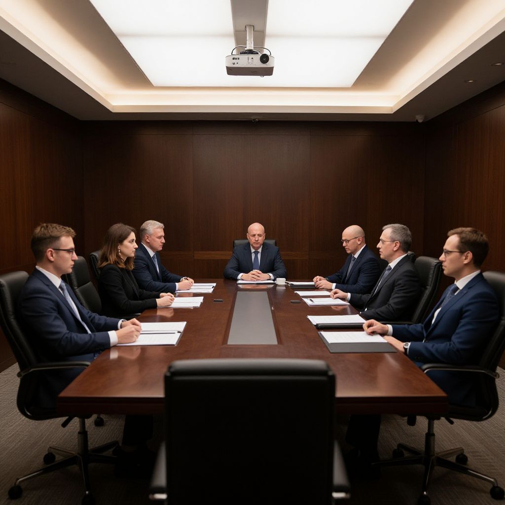 Photograph of a formal corporate boardroom meeting with seven men and one woman, all wearing dark business suits and ties, seated around a long, dark wooden conference table. The room has dark wood-paneled walls and a bright, rectangular overhead light fixture. A projector is mounted on the ceiling. The participants are focused on documents in front of them. The man at the head of the table, central and slightly balding, appears to be leading the discussion. The atmosphere is professional and serious.
