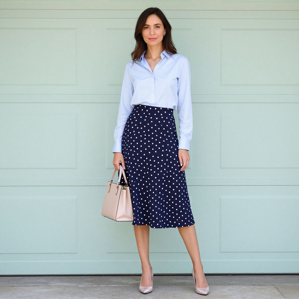 Fashionably styled woman wearing a crisp light blue button-down shirt paired with a navy polka dot midi skirt, accessorized with a neutral handbag and shimmering nude heels, standing confidently against a pastel green garage door backdrop.