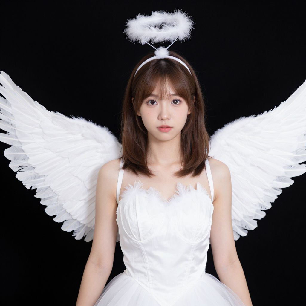 Photograph of an Asian woman with long brown hair, wearing a white dress and large white feathered angel wings, standing against a dark green, blurred