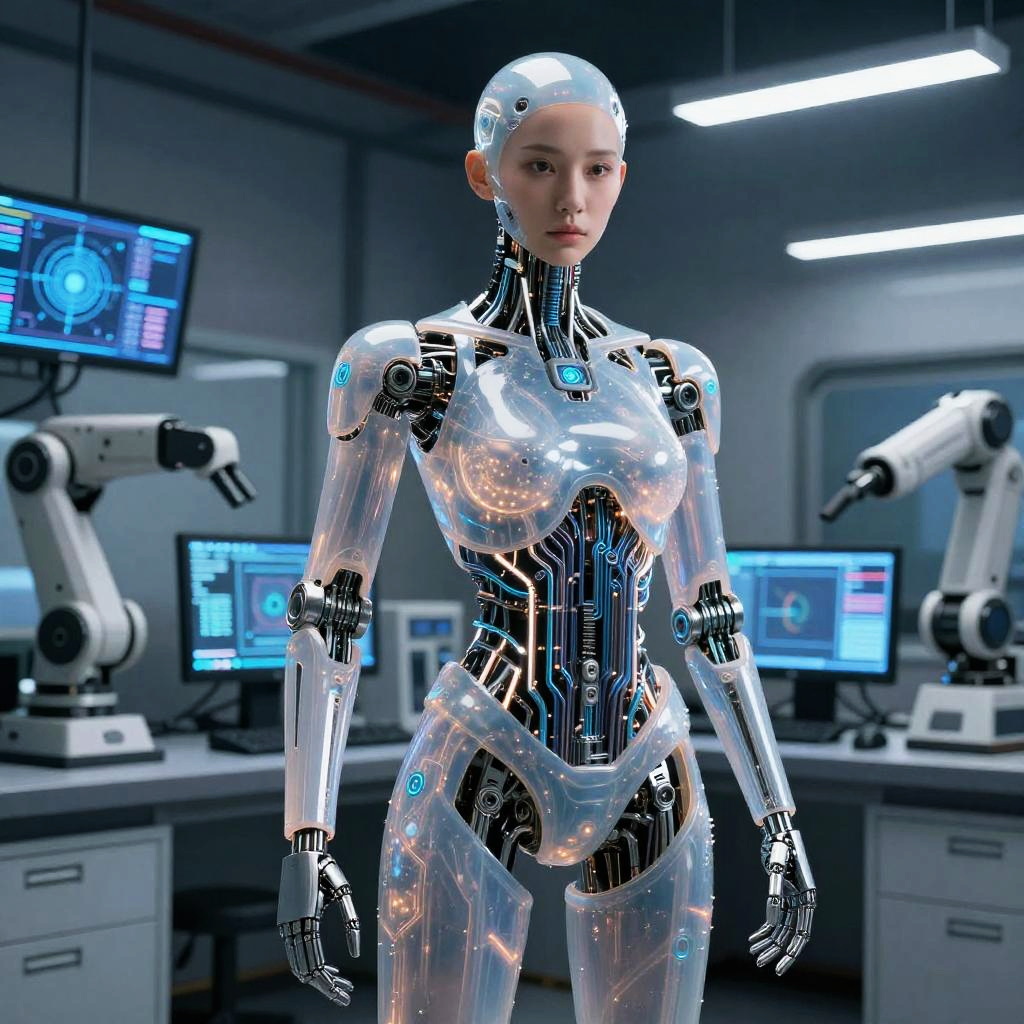 Cosplay ai character blending human and robot aesthetics, featuring metallic limbs and glowing circuits beneath translucent skin, posing in a high-tech laboratory filled with digital screens and advanced robotic equipment, cinematic lighting