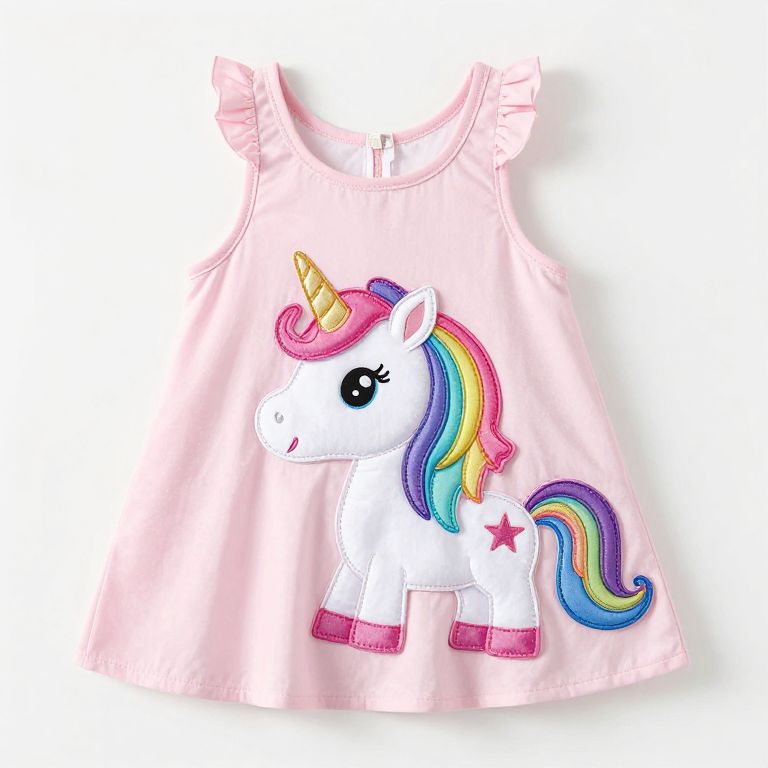 Pink children's dress with white unicorn embroidery, colorful rainbow mane, pink star on hip, and ruffled shoulders, against white background.