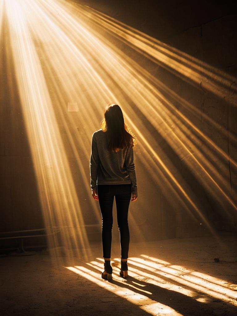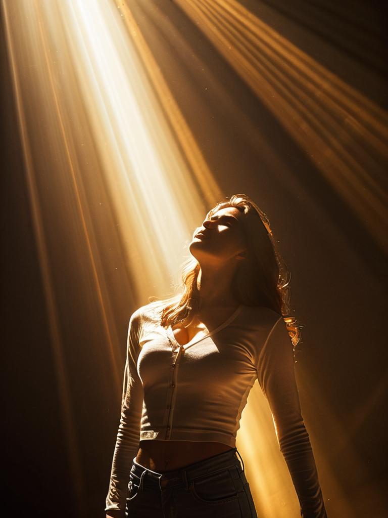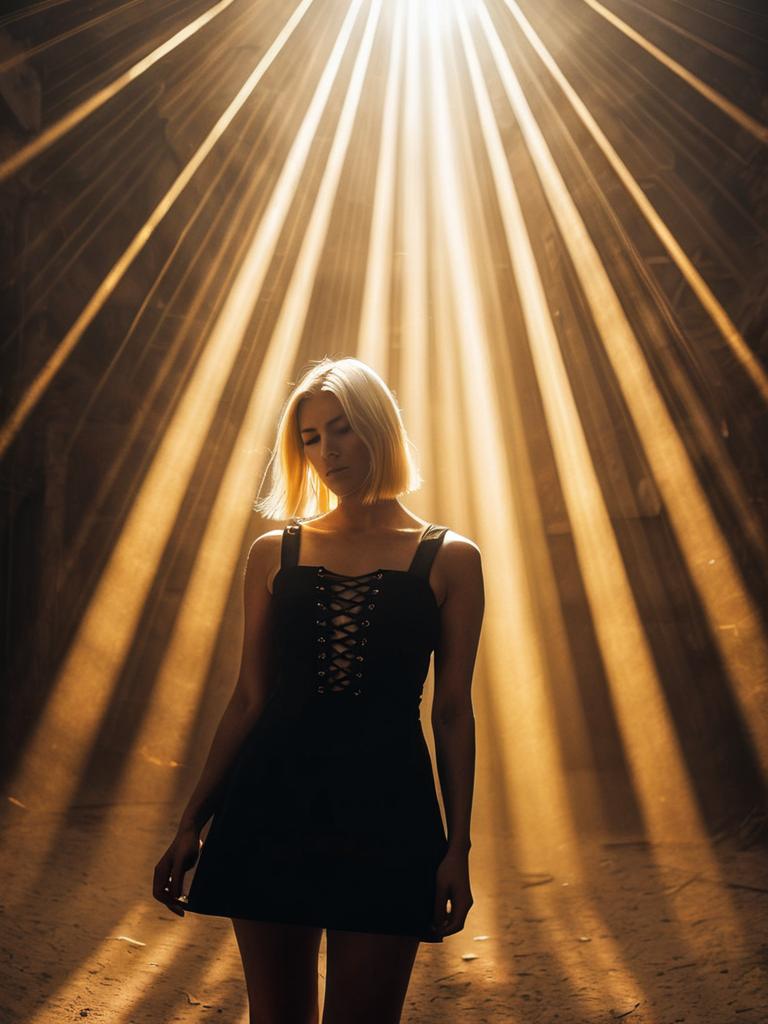 Portrait of a woman with short platinum blonde hair wearing a sleeveless black mini dress featuring a lace-up front and silver eyelet details. She stands gracefully with her head slightly bowed under dramatic radiant beams of warm light filtering from above in a dark, textured background.