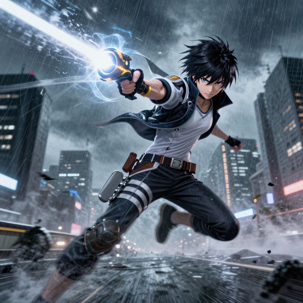 This is a vibrant digital anime-style illustration depicting a dynamic, rain-soaked cityscape at night. A young, black-haired male character with spiky hair, wearing a white shirt, black jacket, and black pants, is mid-leap, aiming a glowing blue energy gun with his right hand. His expression is focused and determined. He has a brown belt with a pouch and thigh straps. The background features tall, illuminated skyscrapers with neon signs, and debris is scattered on the wet, reflective street. Raindrops are visibly falling, adding to the intense, action-packed atmosphere. The character's left hand is clenched, and his right leg is bent, enhancing the sense of motion and urgency.