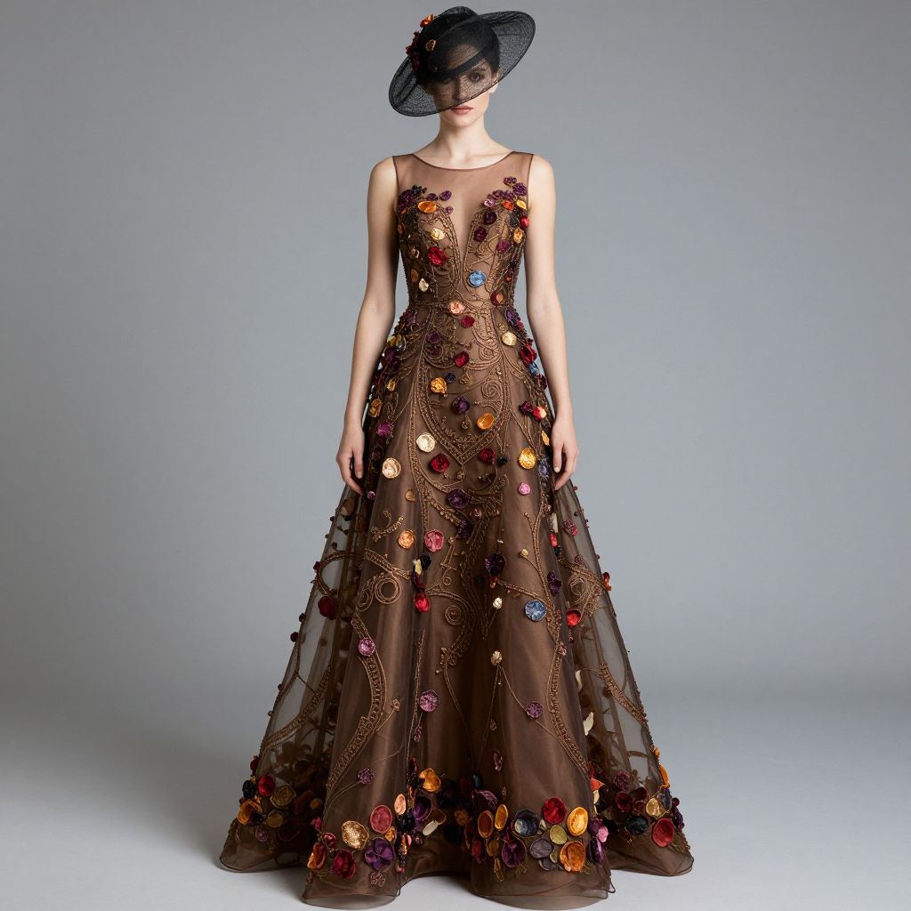 Photograph of a slender woman in a brown, sleeveless, full-length gown adorned with colorful floral appliqués, wearing a black, wide-br