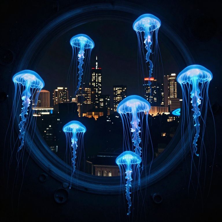 Photograph of glowing blue jellyfish in front of a dark city skyline with illuminated buildings at night, creating a striking contrast.