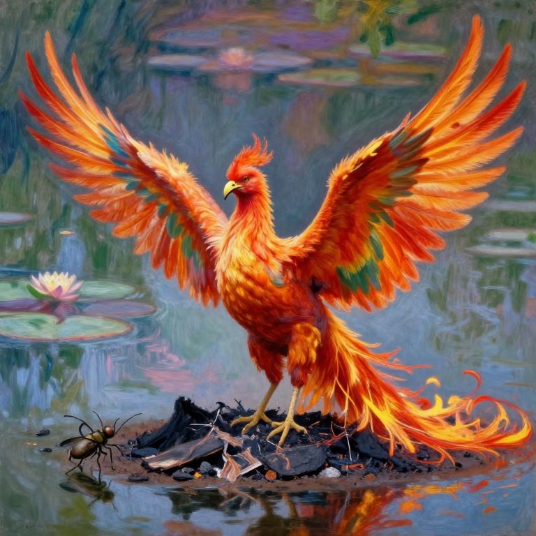 Imagine a fantastical realm where a magnificent phoenix emerges from its bed of ashes, its fiery plumage inspired by the rich colors found in impressionistic landscapes akin to Monet's Water Lilies series. From an insect's perspective at the base of the ashes, witness the awe-inspiring spectacle as the bird's vibrant feathers unfurl against the tranquil reflections on the water's surface. This whimsical composition combines elements of nature's renewal and artistry's fleeting allure, creating a harmonious blend of enchantment and serenity that transcends our ordinary perceptions.