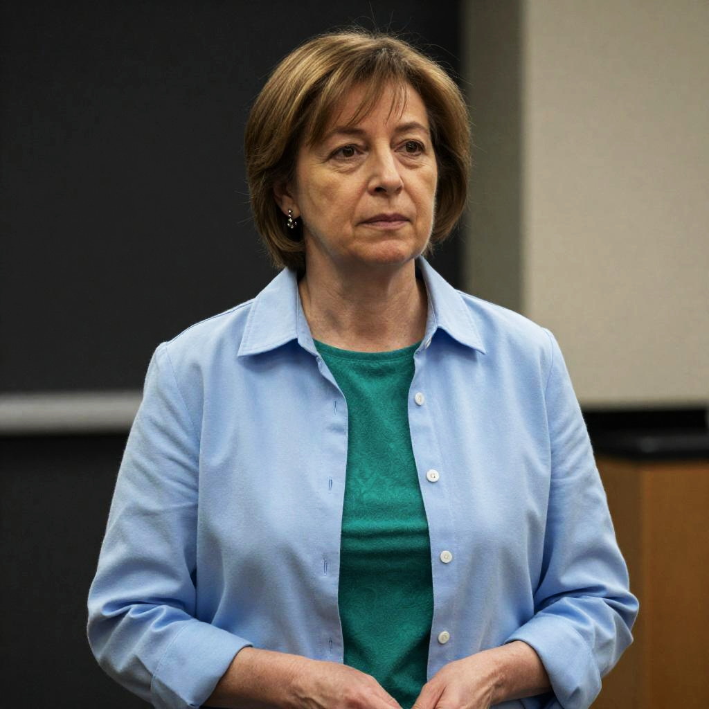 Middle-aged woman with short, light brown hair, wearing a light blue button-up shirt over a green top, standing indoors. She has a neutral expression, looking slightly to the right. Background is blurred, with dark colors and indistinct objects. Her hands are in front of her.