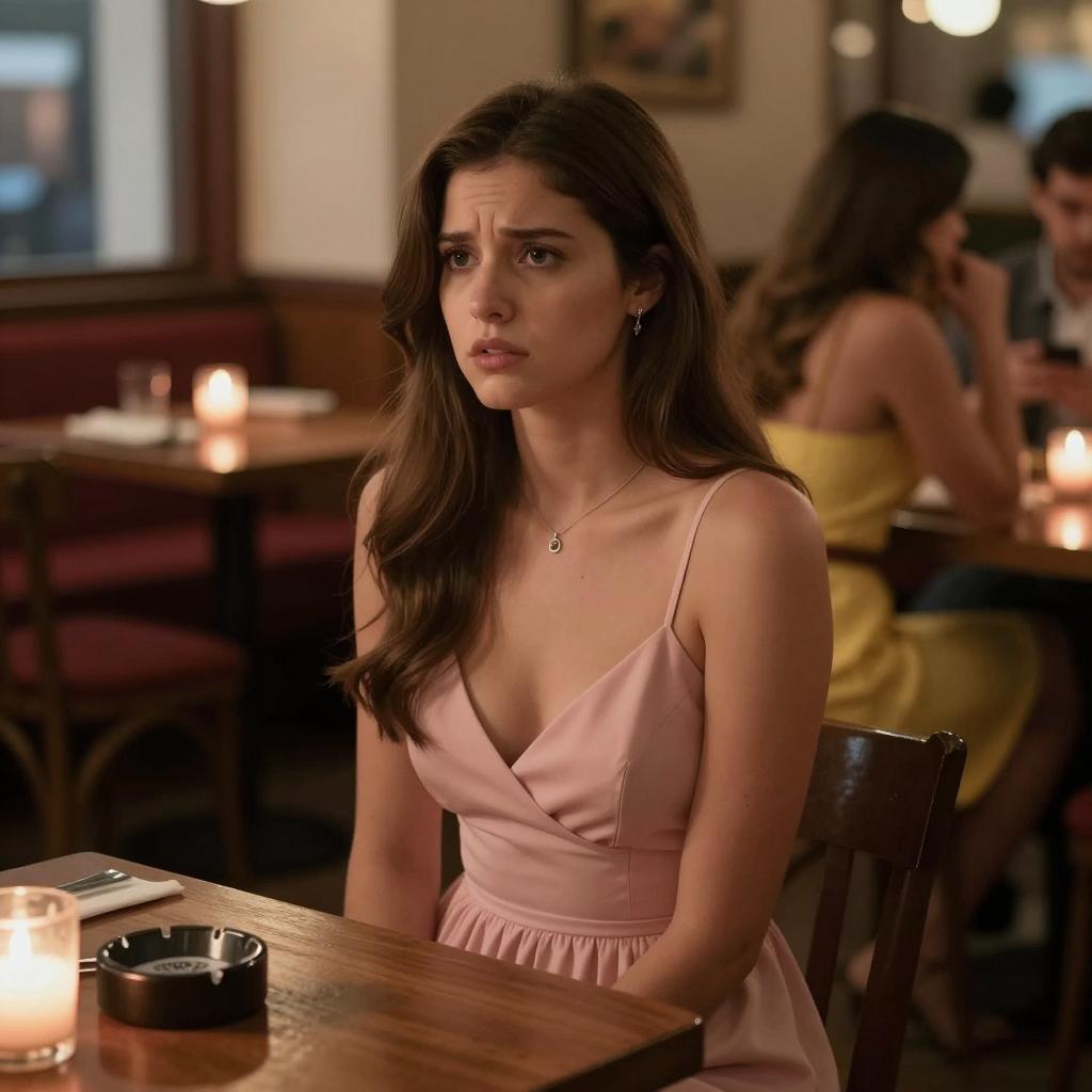 Woman with short, dark brown hair wearing a sleeveless, deep red top, sitting at a table. Two lit candles in front. Dark background with window panes. She rests her head on her right hand, looking slightly to the right. Intense, slightly curious facial expression. Two glasses on the table. Dim lighting.