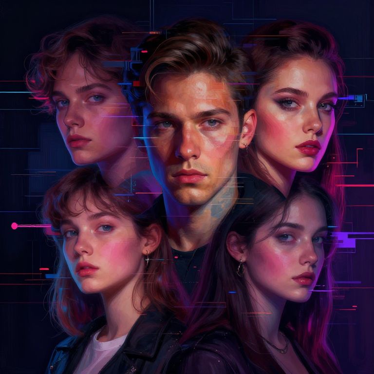 AI image fuser blending classic portrait styles with glitch art and neon effects, creating a cyberpunk-inspired artwork with deep shadows, electric highlights, and complex layering, digital painting with a futuristic vibe.