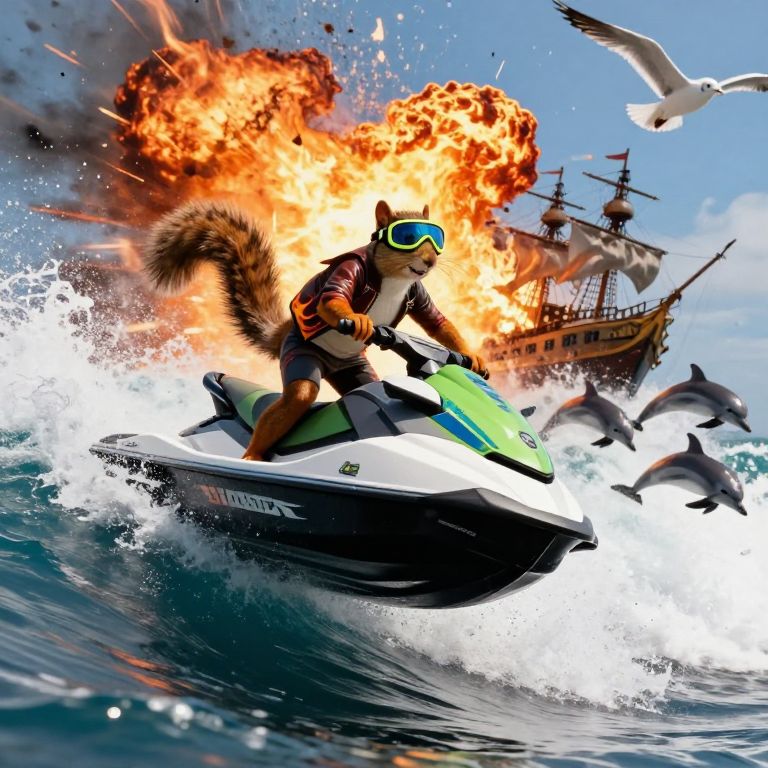 A squirrel absolutely dominating on a jet ski, mid-air off a massive ocean wave, The squirrel, rocking a tiny pair of neon goggles, a leather jacket with flames on the back, and an inexplicably confident smirk, grips the jet ski handles like it’s trained for this its whole life, Behind it, a massive explosion erupts from a pirate ship, sending flaming debris into the sky, Seagulls scatter in terror, and dolphins leap alongside in awe