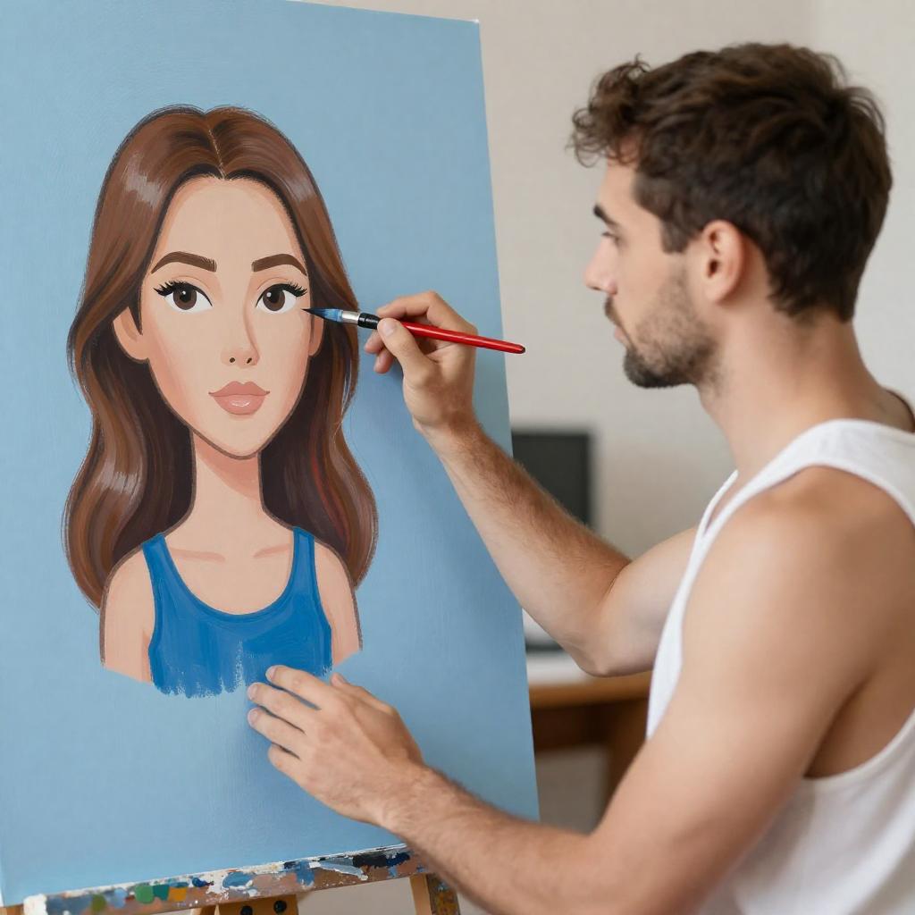 Photograph of a hand holding a pencil sketch of a man's face with short hair, neutral expression, on white paper. Background includes a gray computer keyboard and a white cup with black coffee. Hand is on the right, cup on the right background.