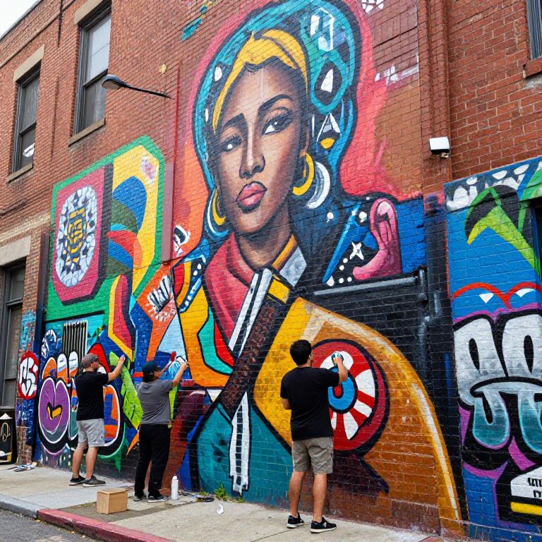 Photograph of vibrant street mural depicting an African-American woman with colorful hair, large eyes, and bold clothing, surrounded by graffiti artists. Urban brick wall