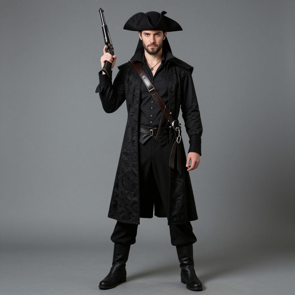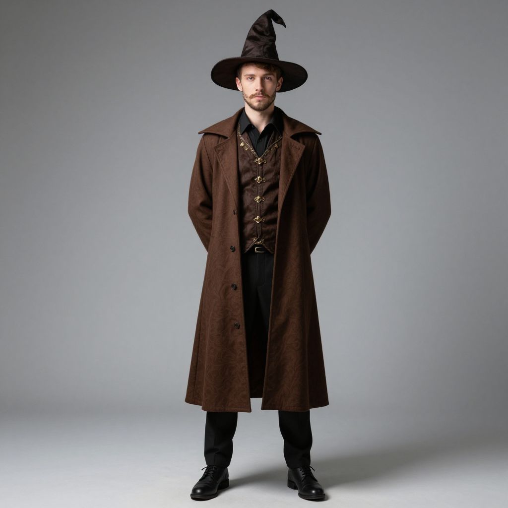Photograph of a fair-skinned man with a trimmed beard, standing against a plain gray background. He wears a tall, black, pointed witch hat, a dark brown, long, knee-length coat with brass buttons, and black pants. His hands are in his coat pockets. He also wears black, polished shoes. The lighting is even, highlighting the textures of his clothing and the sheen of his hat and shoes. The overall style is reminiscent of a historical or fantasy costume. The man's expression is neutral, and he stands straight, centered in the frame.