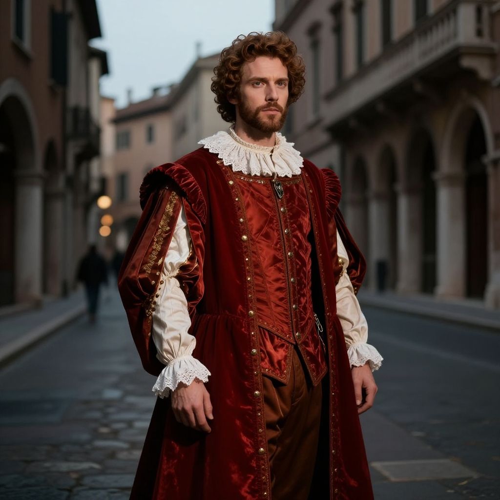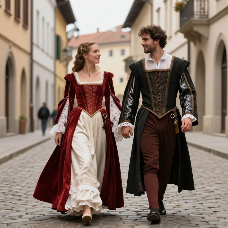 A couple dressed in Renaissance attire, with flowing fabrics and lace details, walking hand in hand along a cobblestone street lined with Renaissance architecture.