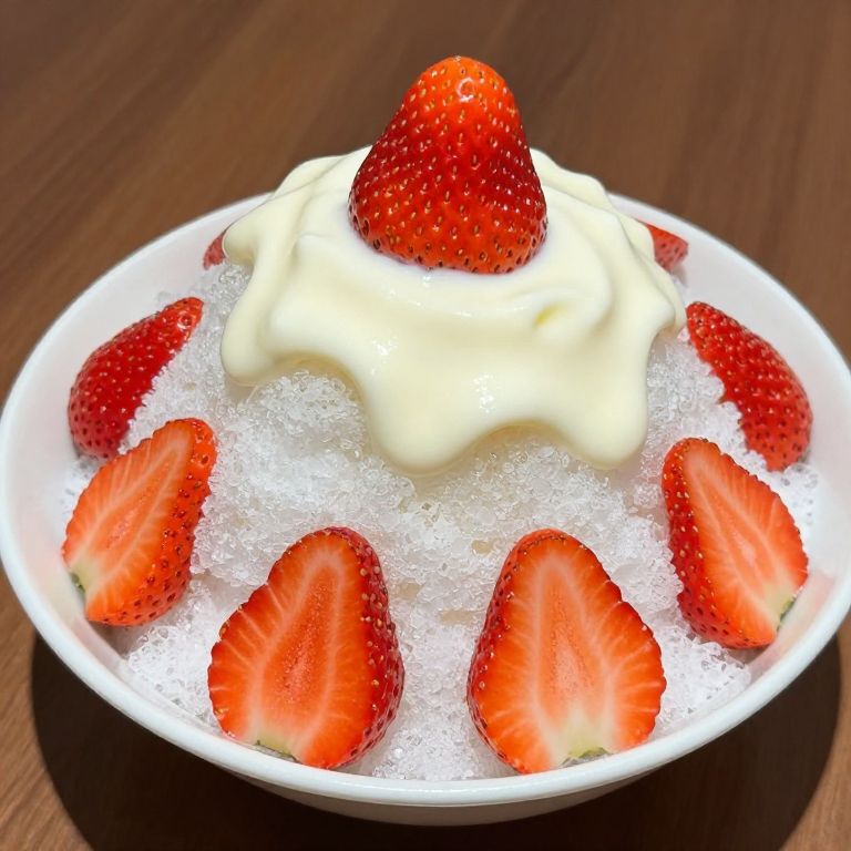 Delicate Japanese ice shaved dessert topped with vibrant strawberry slices, creamy yogurt, and condensed milk, served in a pristine white bowl.