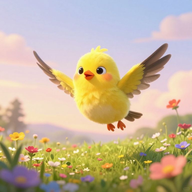A whimsical scene featuring Piolin, the bright yellow bird, fluttering joyfully above a meadow filled with colorful wildflowers, soft pastel sky at dawn, detailed feathers, cartoonish style emphasizing warmth, innocence, and playful energy.