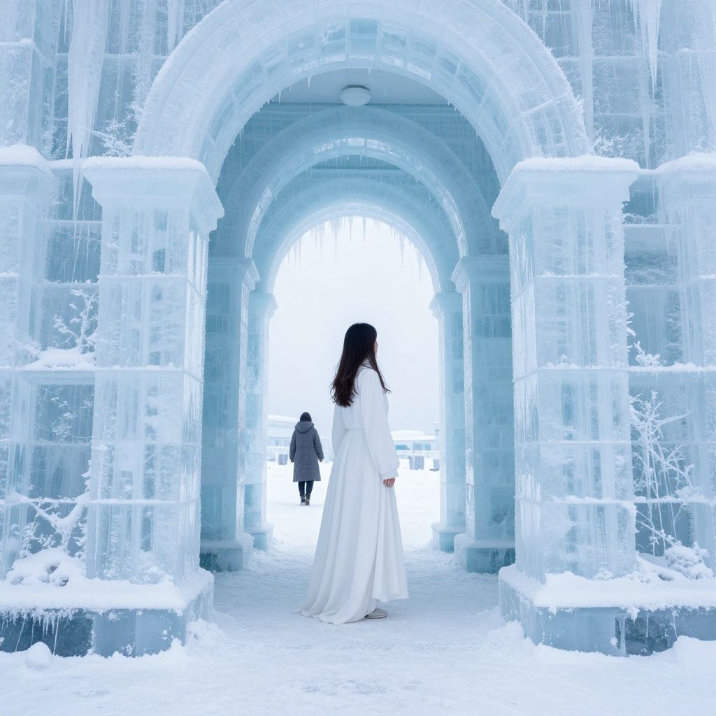 A woman in a flowing white gown stands at the entrance of an icy, arched corridor, her back turned as she gazes toward another figure walking away through a luminous tunnel of frost and snow, framed by towering columns and cascading icicles.