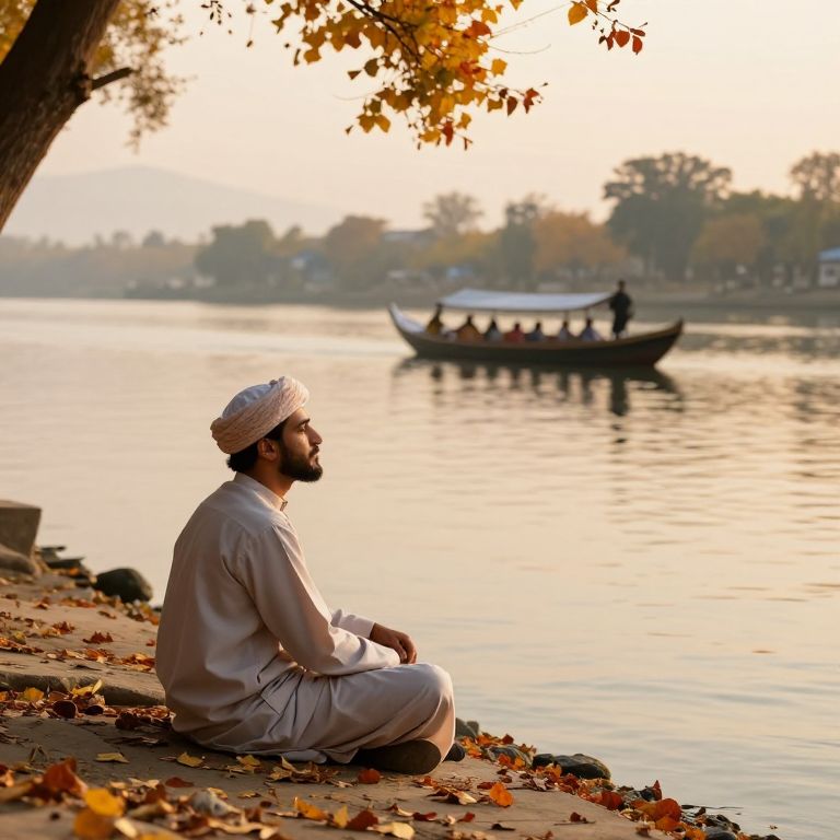 Photograph of a bearded man in white traditional attire and turban, sitting on a riverbank with autumn leaves, watching a boat with passengers in