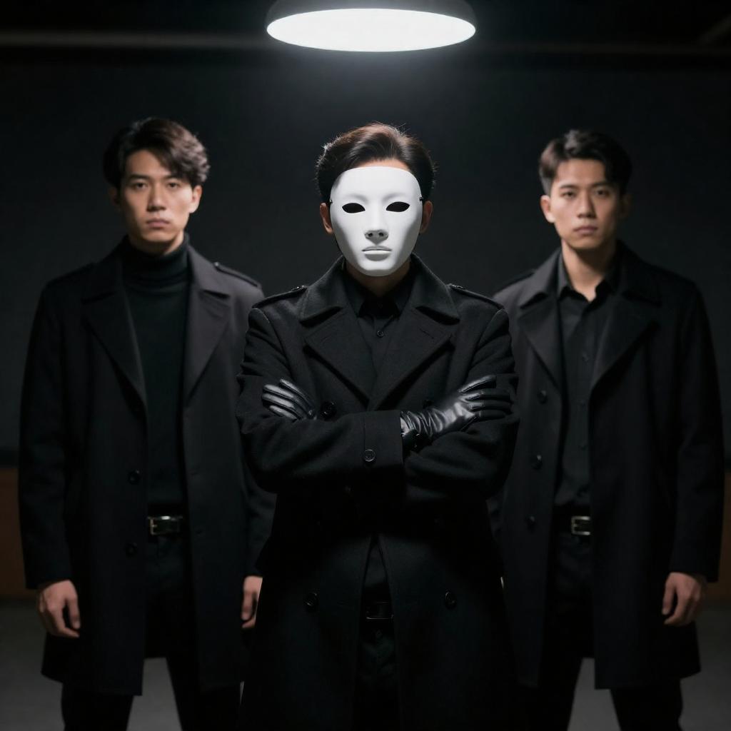 Photograph of a dark, dimly lit room with three men. Central figure wears a white, featureless mask, black coat, and gloves, standing with arms crossed. Two men in black coats stand on either side, both with dark hair and serious expressions. Bright circular light above central figure contrasts with shadowy background.