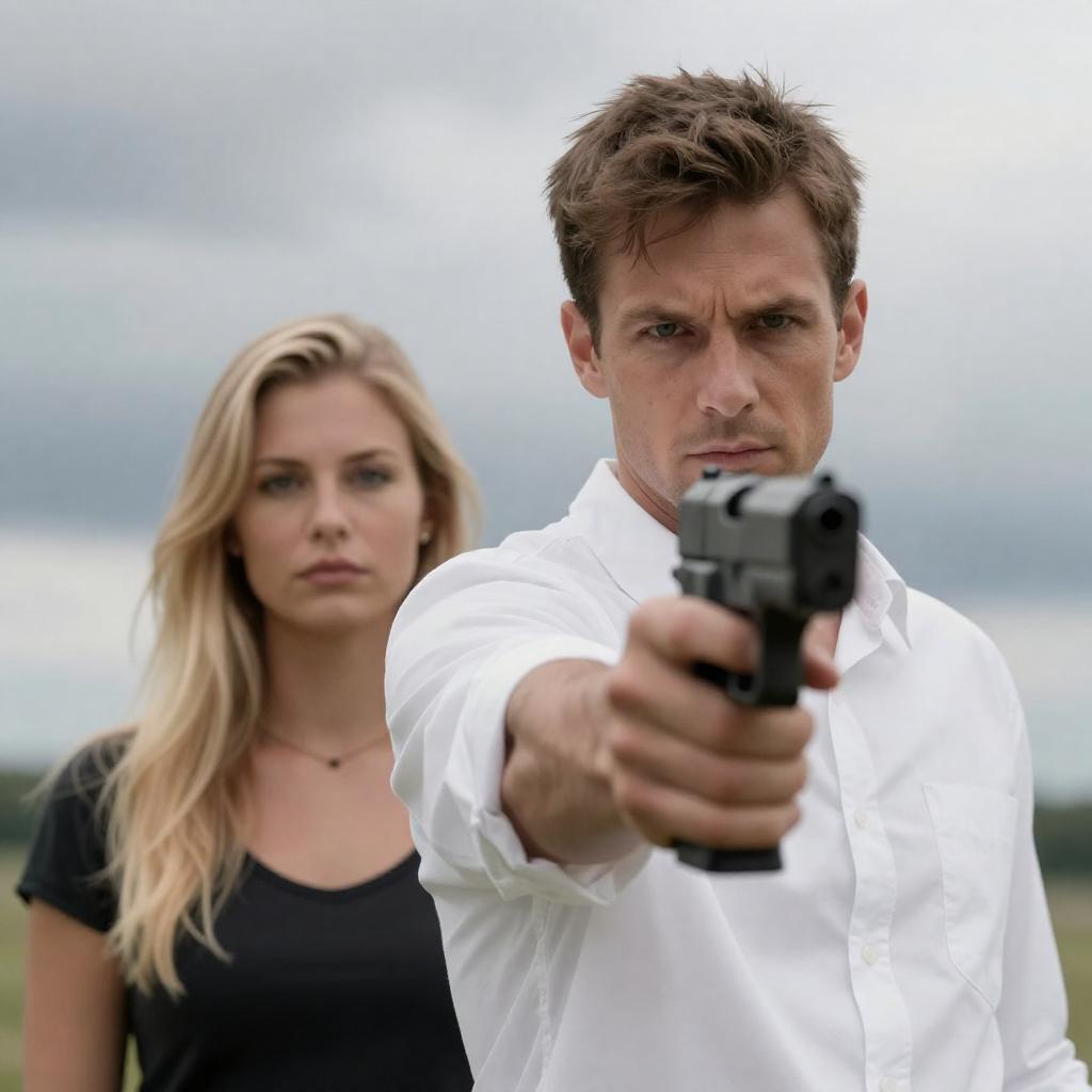 Black man in grey suit with red tie, holding gun, intense expression. Blonde woman with black coat, wooden sword, background of bare trees. Both in action pose, man in foreground, woman in background. Bright daylight.