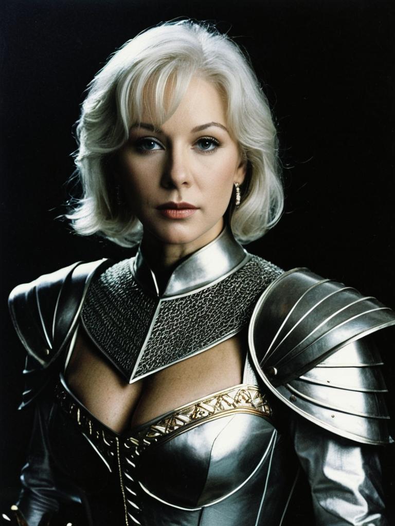 Portrait of a woman with blonde hair wearing a detailed medieval-style silver armor with shoulder plates and a red cape. The costume features intricate metallic designs and subtle shadow contrast on the folds, evoking a character similar to those in fantasy or historical films such as Excalibur.