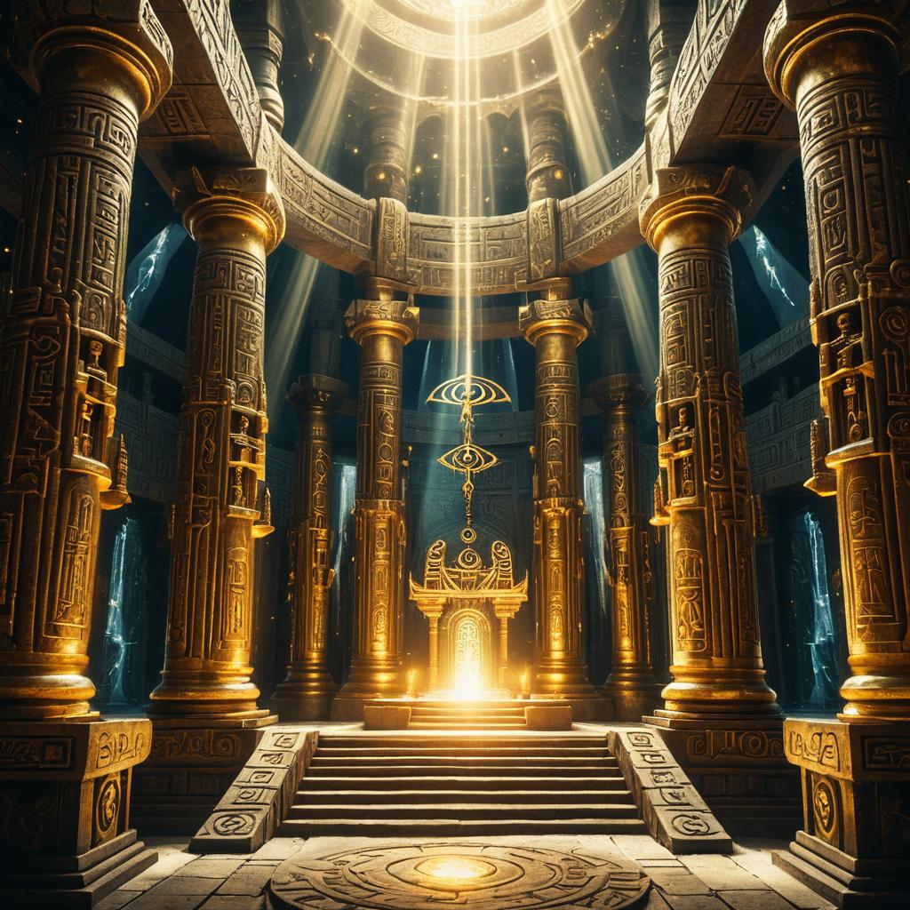 Fantasy concept art of a arcane temple with intricate glyph carvings, hovering enchanted artifacts, golden pillars, celestial light beams, mystical reverence, magical aura, softly lit interior.