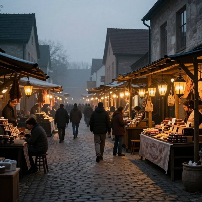 Old-fashioned trolley car at a historic town square during a lively festival, decorated with string lights and bunting, children playing nearby, cobblestone streets, warm golden hour lighting, rich textures, charming details in architecture and trolley design, painterly style.