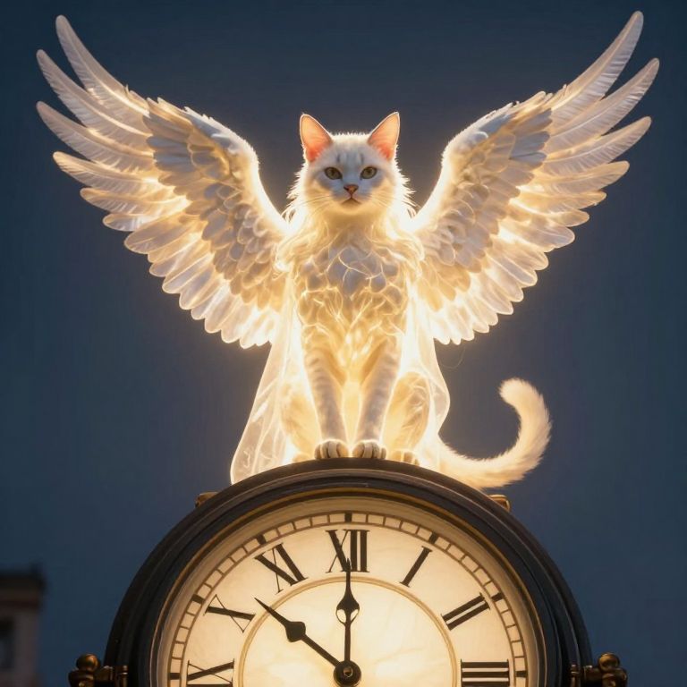 An ethereal feline guardian, cloaked in wings of radiant light, stands atop a timeless clock, its presence a silent testament to the delicate balance between the fleeting moments of existence and the eternal quest for freedom.