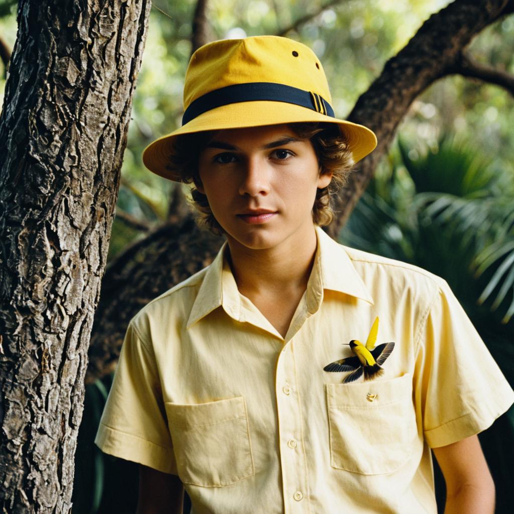 Portrait of a young boy wearing a yellow short-sleeved collared shirt and matching yellow skipper hat standing outdoors near a tree. A small yellow bird with black wings is perched on the breast pocket of his shirt. The background features blurred green foliage, suggesting a natural, forested environment.